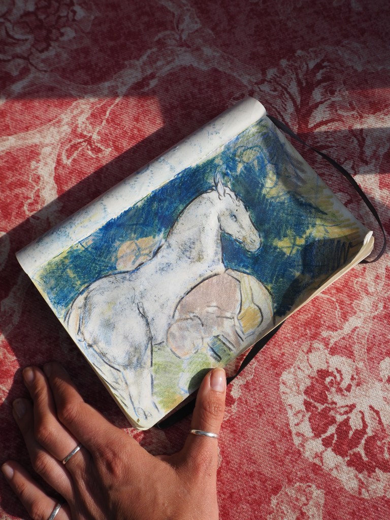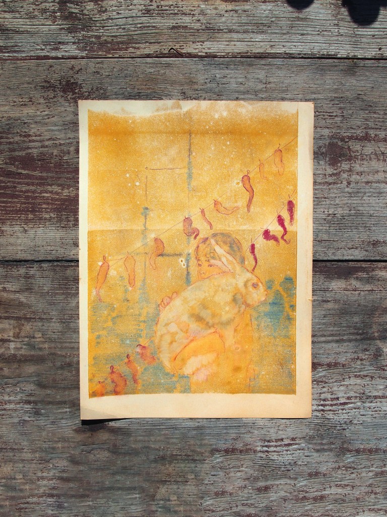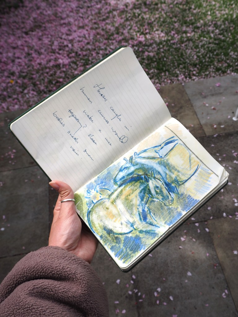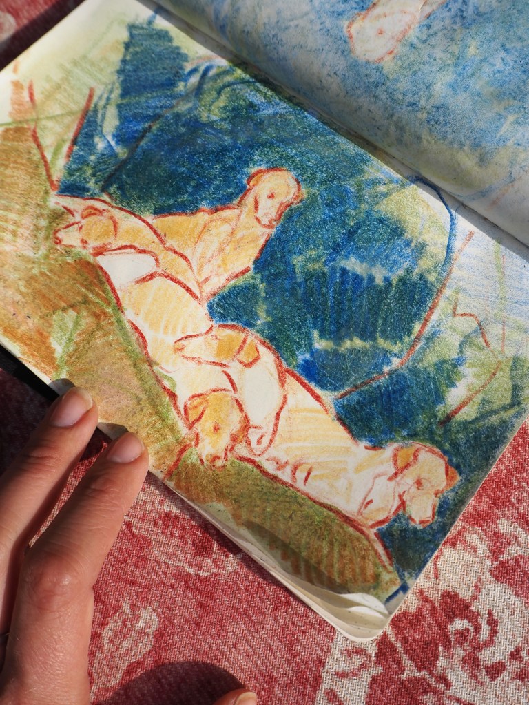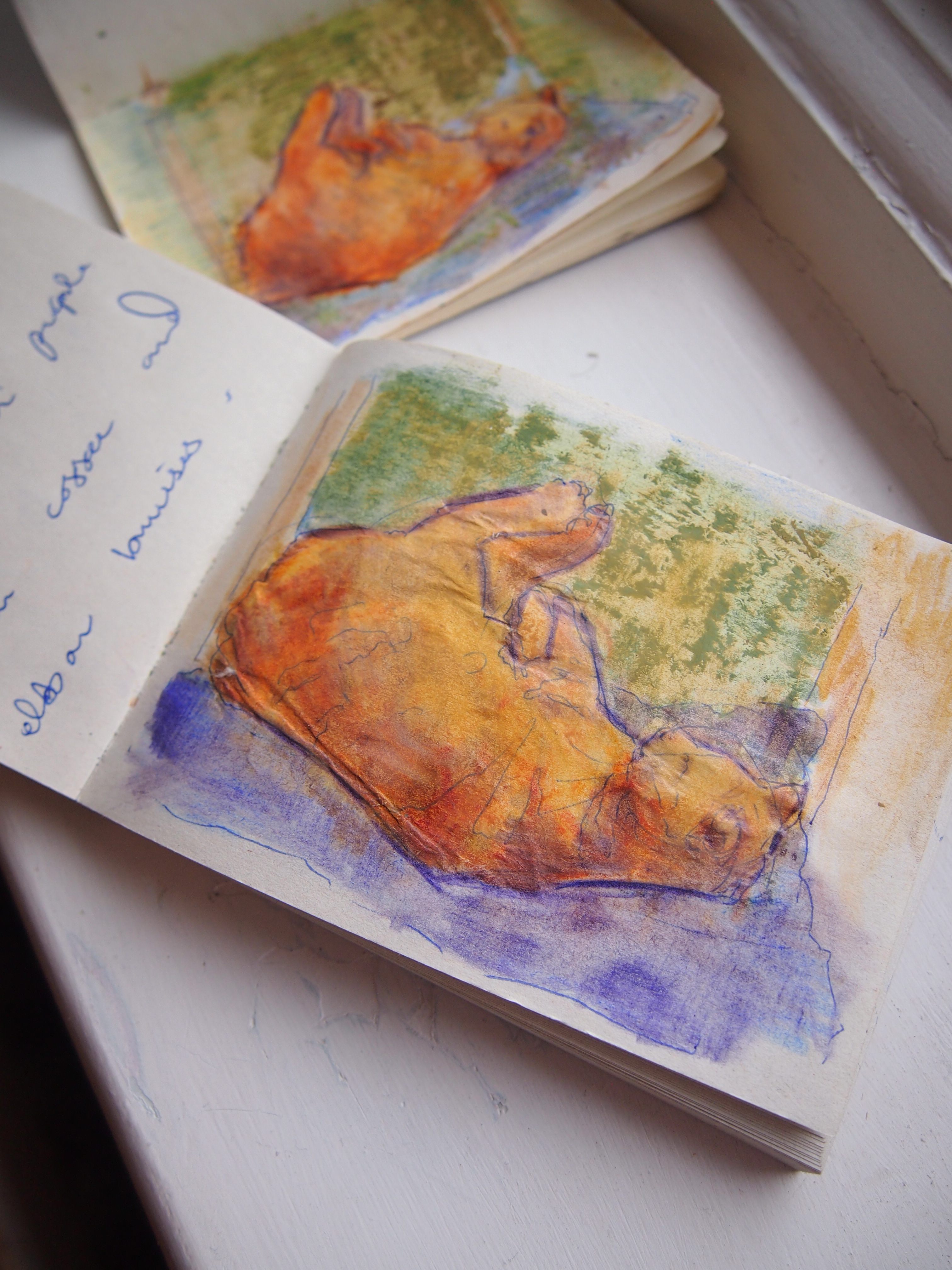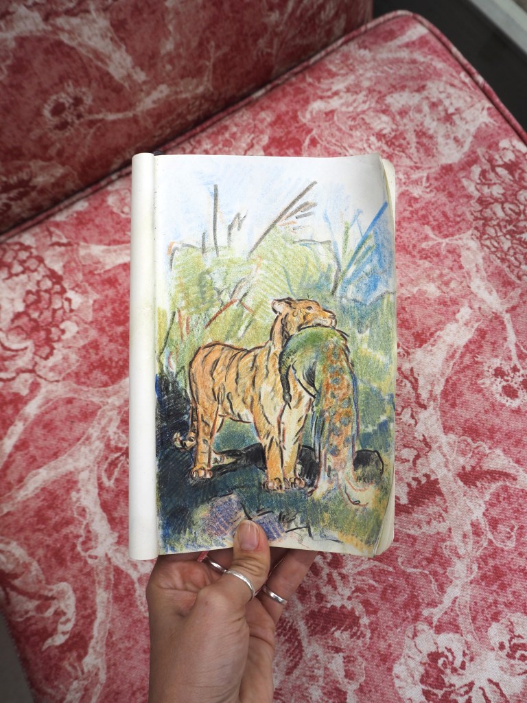 All of her prints start out as rough chalk, pencil and pastel sketches. She carries small newsprint notebooks with her everywhere filled with thoughts, visual observations and these initial hand-drawn designs. The compositions are then often worked up into larger designs digitally, allowing her to separate the colour layers for many of her finished prints.