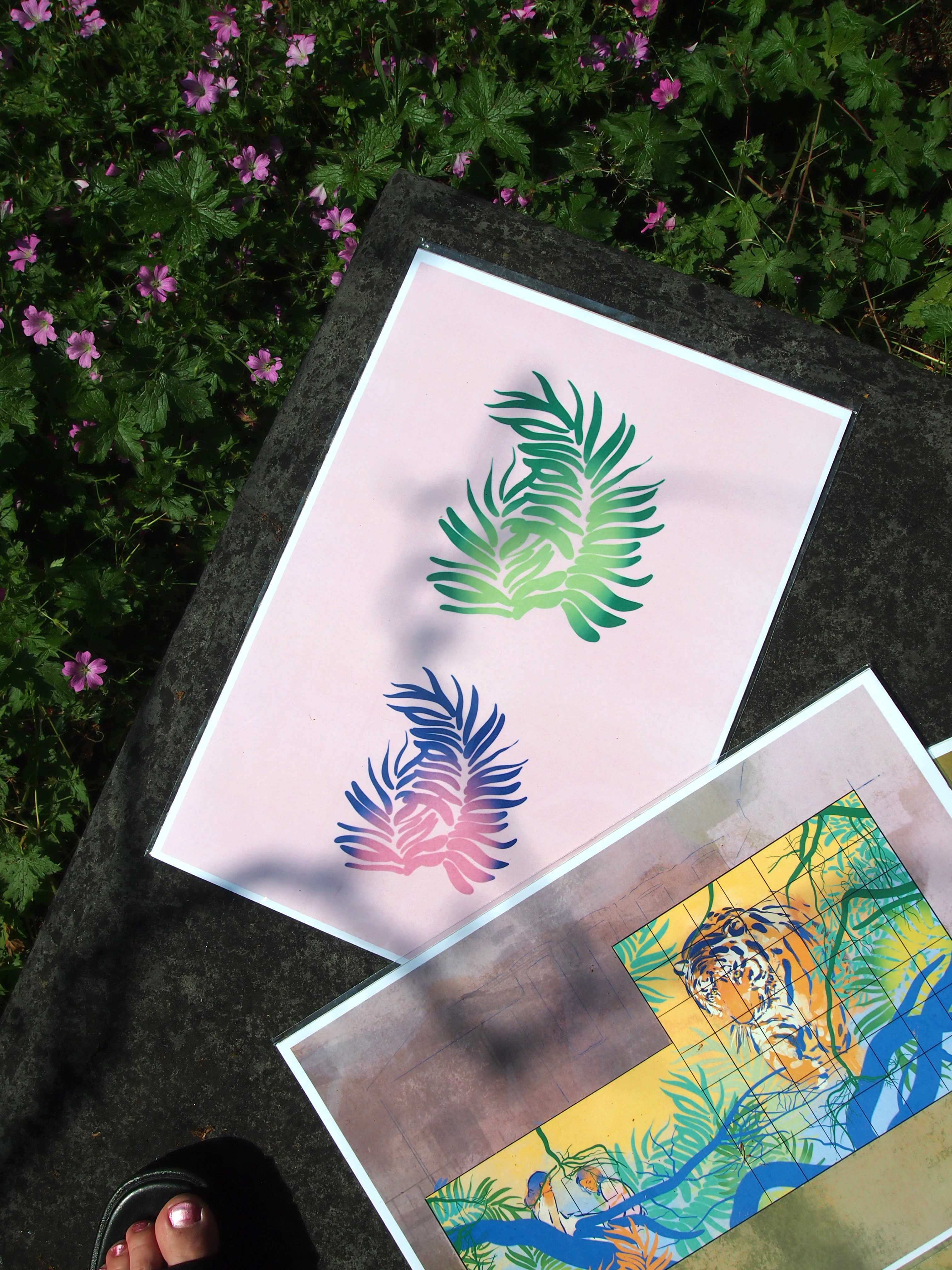 Spray painting workshop exploring freehand drawing, stencils and colour-fades, West London 2023