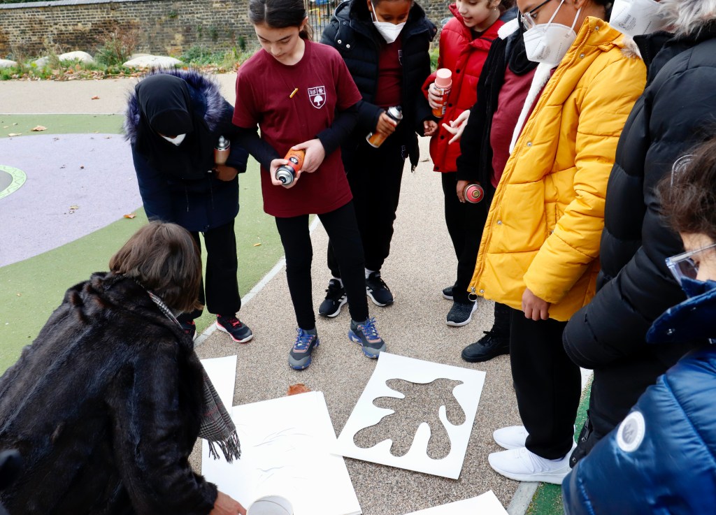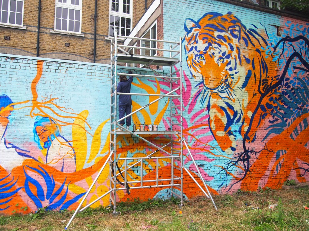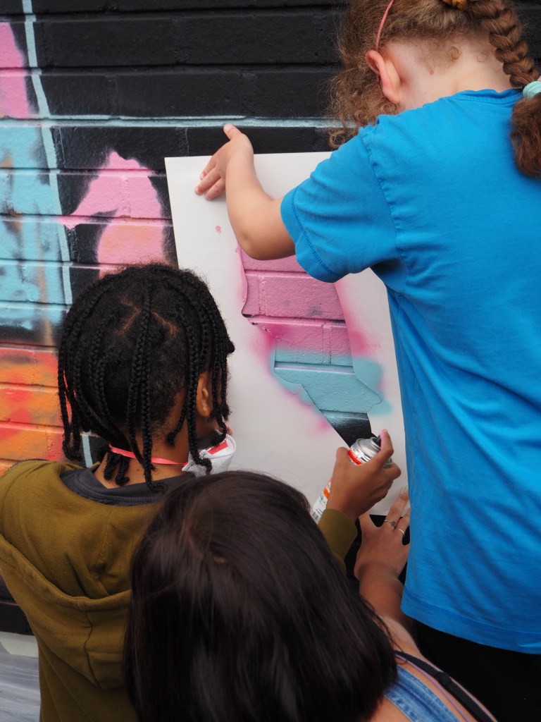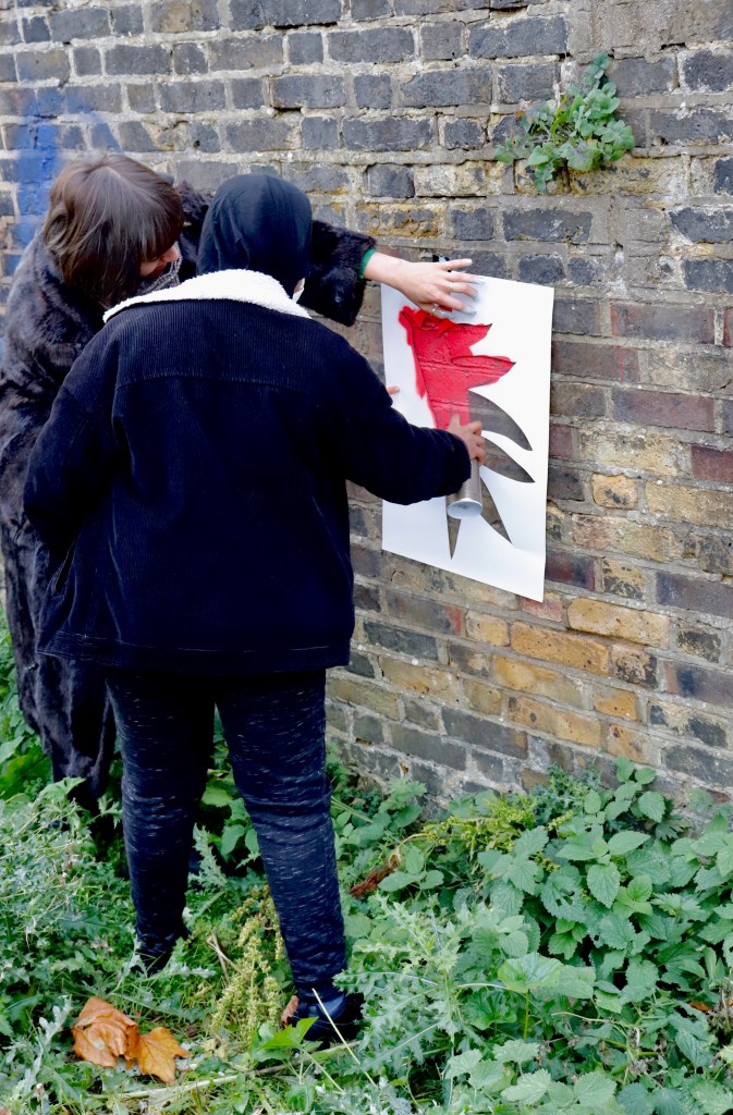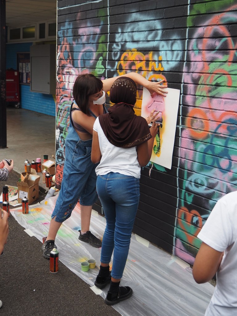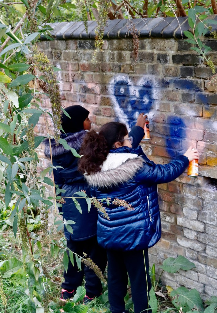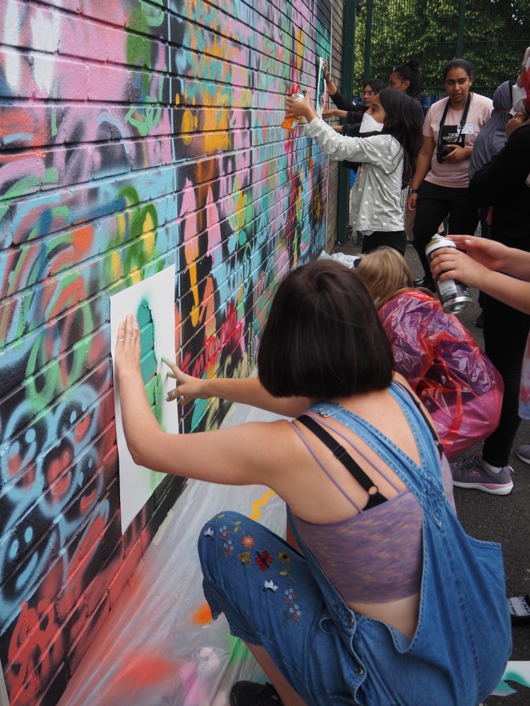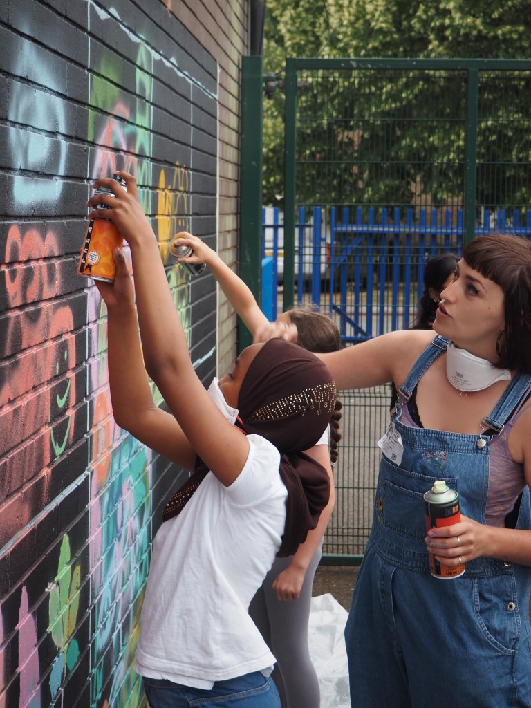 Georgia also ran a pop-up mural workshop in collaboration with Berrymede Junior School and Artification, teaching school children how to use stencils and safely work with spray paints.
