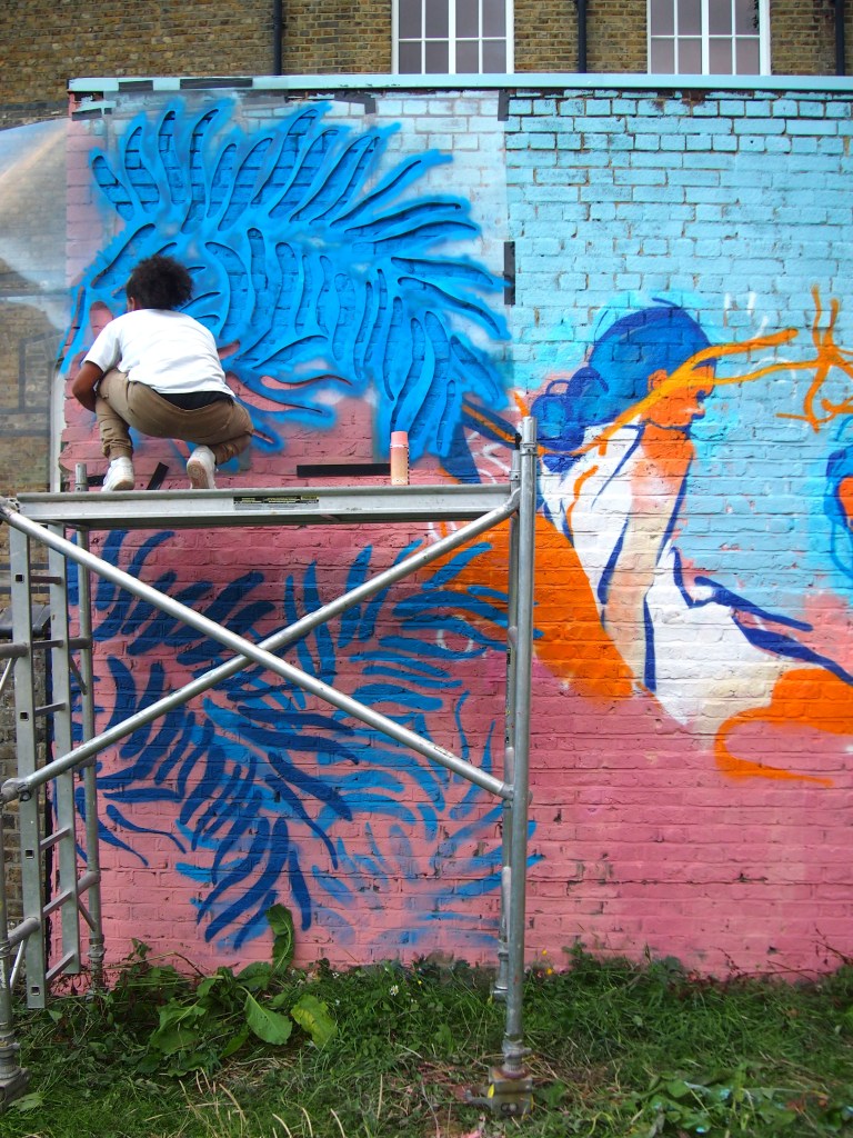 Public engagement has been a key focus of this project. Georgia wanted the positive impact of the mural to reach beyond its visual presence long-term, and for the work to exist as part of the local narrative of South Acton. With this in mind she actively sought to involve members of the Acton Gardens Community Centre in the creation of the mural. In collaboration with Artification she gave a selection of young adults and teenagers a fully-paid opportunity to assist in painting the mural. This was an enlightening and well-received experience for all involved. Georgia shared her technical knowledge as a muralist, and learnt in return a wealth of information surrounding the historical and contemporary community of Acton.
