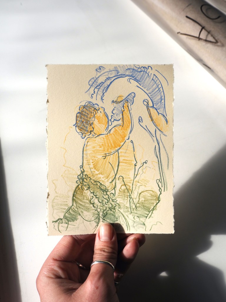 Above: A Visit in Gold, limited edition stone lithograph on cream BFK Rives, 150mm x 110mm, 2025