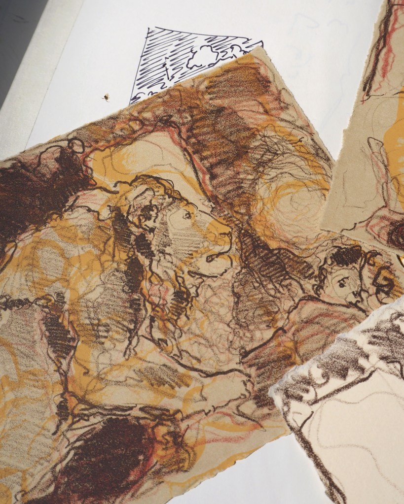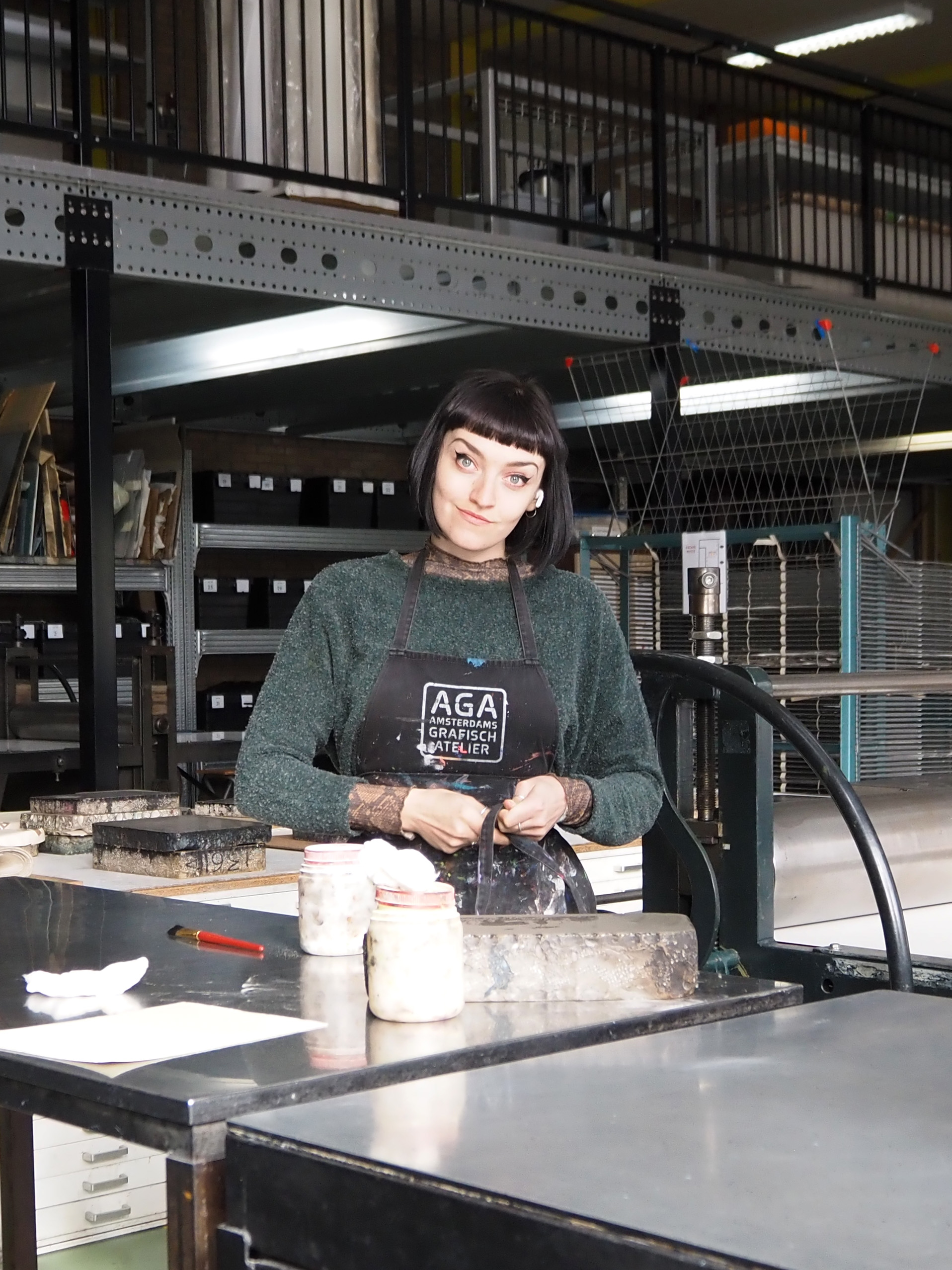 Since 2023 Georgia has undertaken a number of month-long research trips to Aga Lab print studio in Amsterdam, working as an artist in residence. During her residency periods she chose to refine her knowledge of both traditional and non-toxic stone lithography processes. Since 2023 lithography has been classified as a red list endangered craft in the UK. Georgia’s printmaking explorations developed into a series of playful editions, contemplating this beautiful printmaking technique.