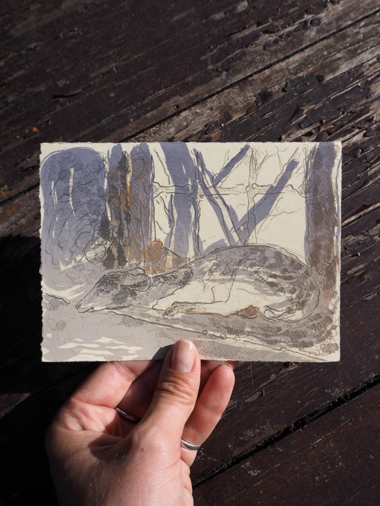 Above: The Little Deer, limited edition stone lithograph on cream BFK Rives, 150mm x 110mm, 2025