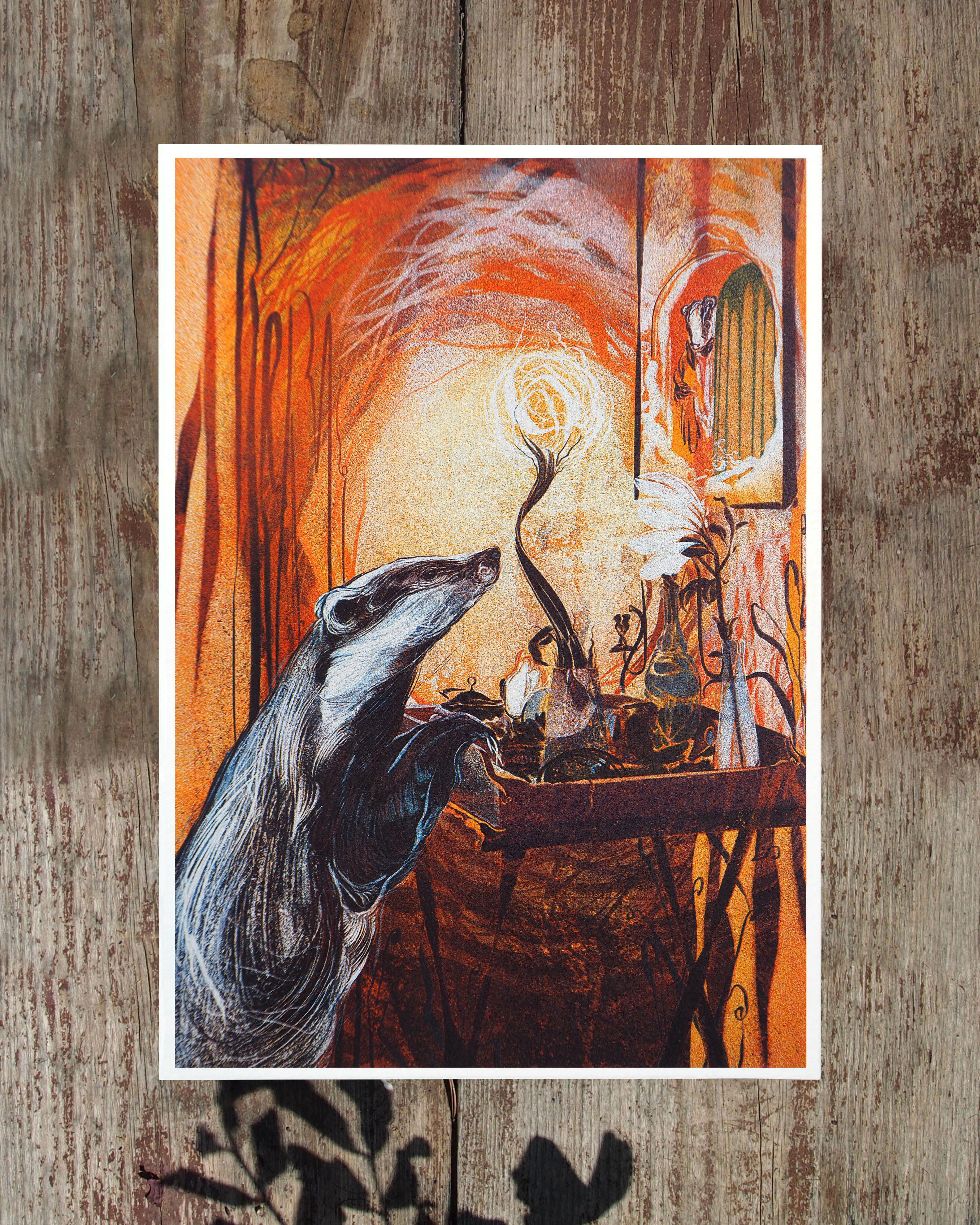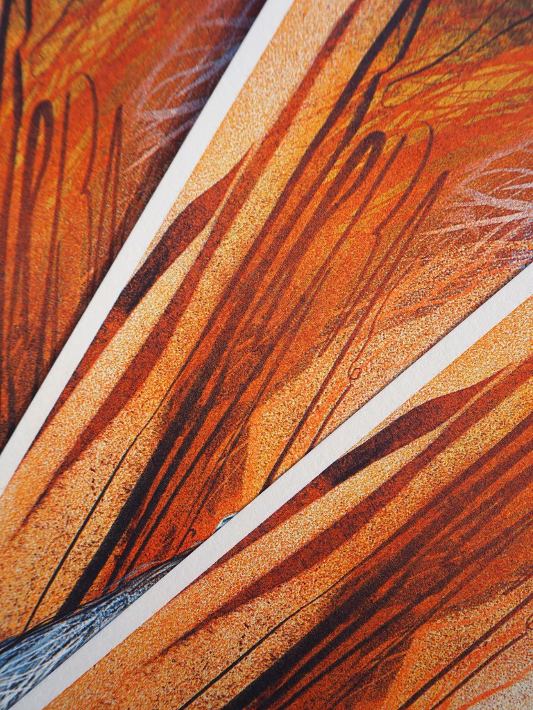 Risography is a mechanised form of planographic printmaking with a more climate conscious appeal than its traditional or digital counterparts. This particular edition is designed in response to a book Georgia loved as a child The Wind in The Willows. It is pressed with warm sunflower, Blue and red Riso inks made from waste rice-bran.