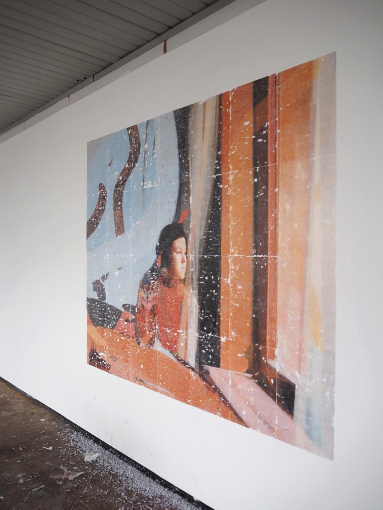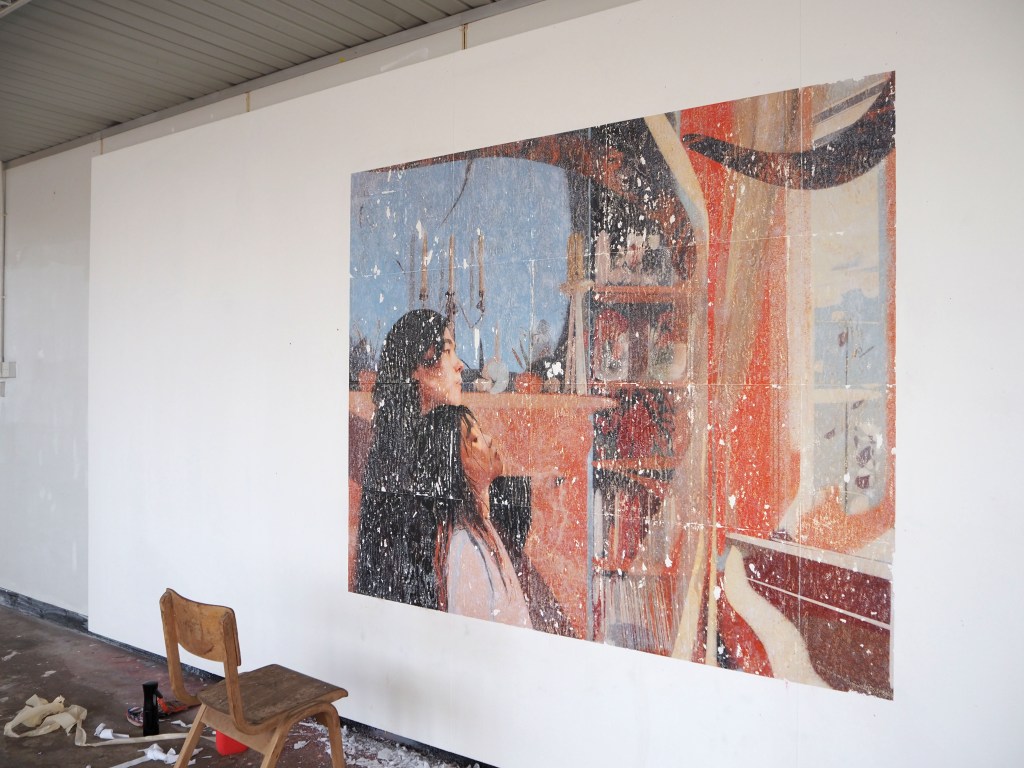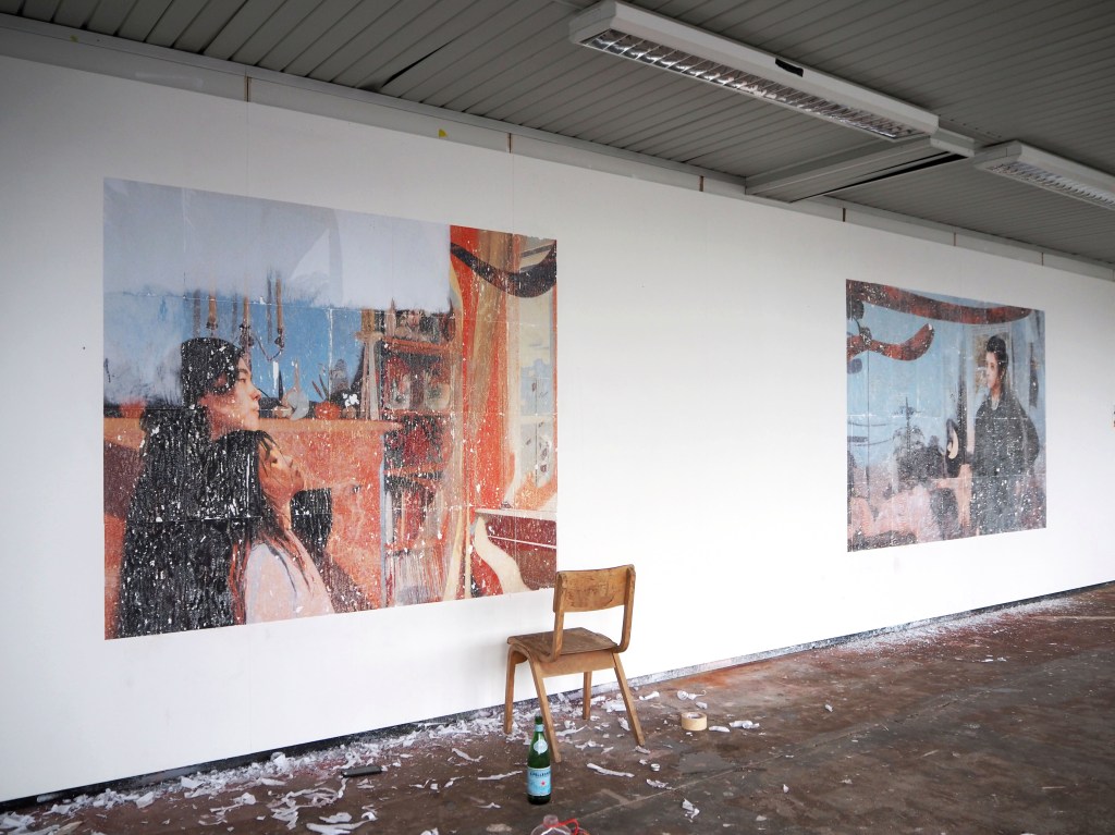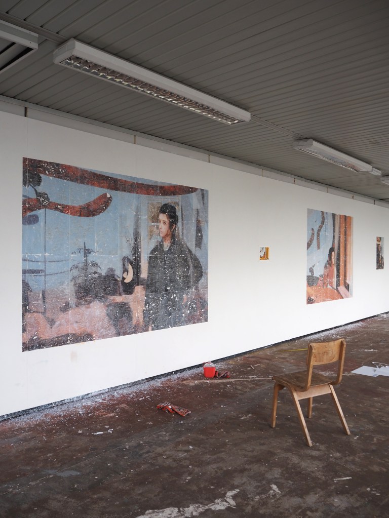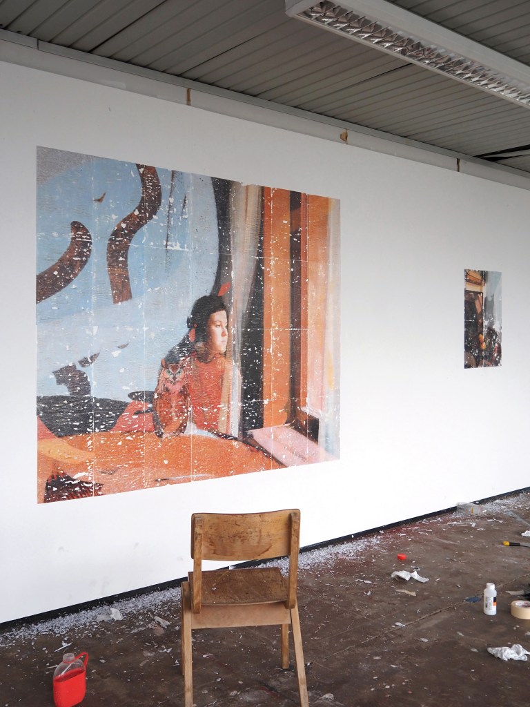 The subject matter of each mural is lifted from the interiors of Georgia’s temporary home during her residency month in Norwich. Her painted figures pause in a moment of peace, surrounded by a fragmented sanctuary. The gentle, comfortable nature of these spaces softens as though absorbed by time or disaster, like the brightly chipped frescoes guarding the walls of Herculaneum and Pompeii.