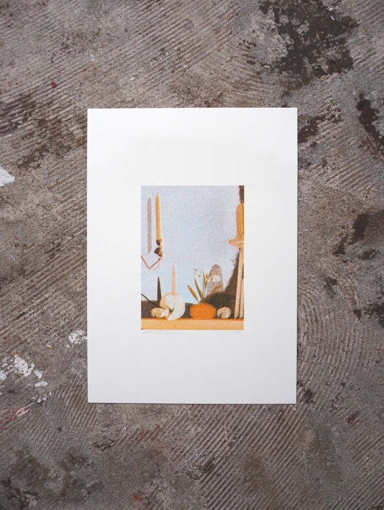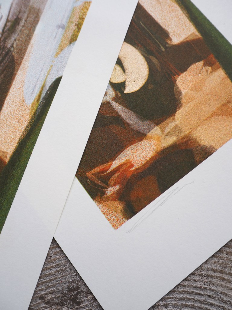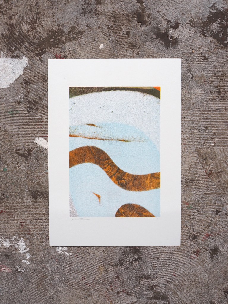 To compliment her mural installation Georgia created nine print editions. Each edition highlights elements of texture and form lifted from her murals that the artist wished to preserve. Intimate, colourful ochre and cyan interiors abstracted through the grainy medium of risographic duplication.