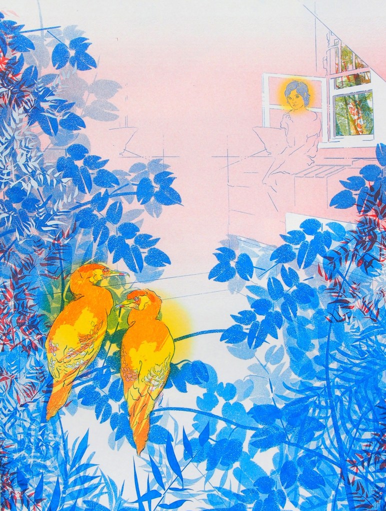 Here a piece of moss found in the bed becomes a jungle. It slides inside the mind to fill another dormant day with colour: pink nettled ankles and sunburnt shoulders; the jewelled blue of a kingfisher flung through the air. A colour turned over and over by a persistent brain becomes smooth and vivid, ripe and ready to press into a print.