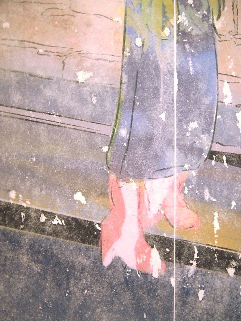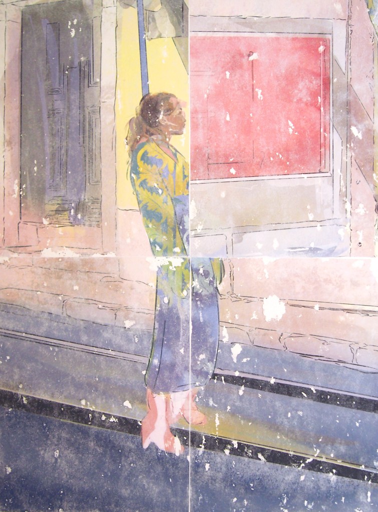 Traditionally, the medium of ‘transfer’ is used to print imagery onto fabric. Georgia Green has chosen to use a variation of this technique in her exhibition, transferring each print directly onto the walls of the gallery. The result is a series of vulnerable and temporary frescoes, depicting ordinary and fragile moments of urban life.